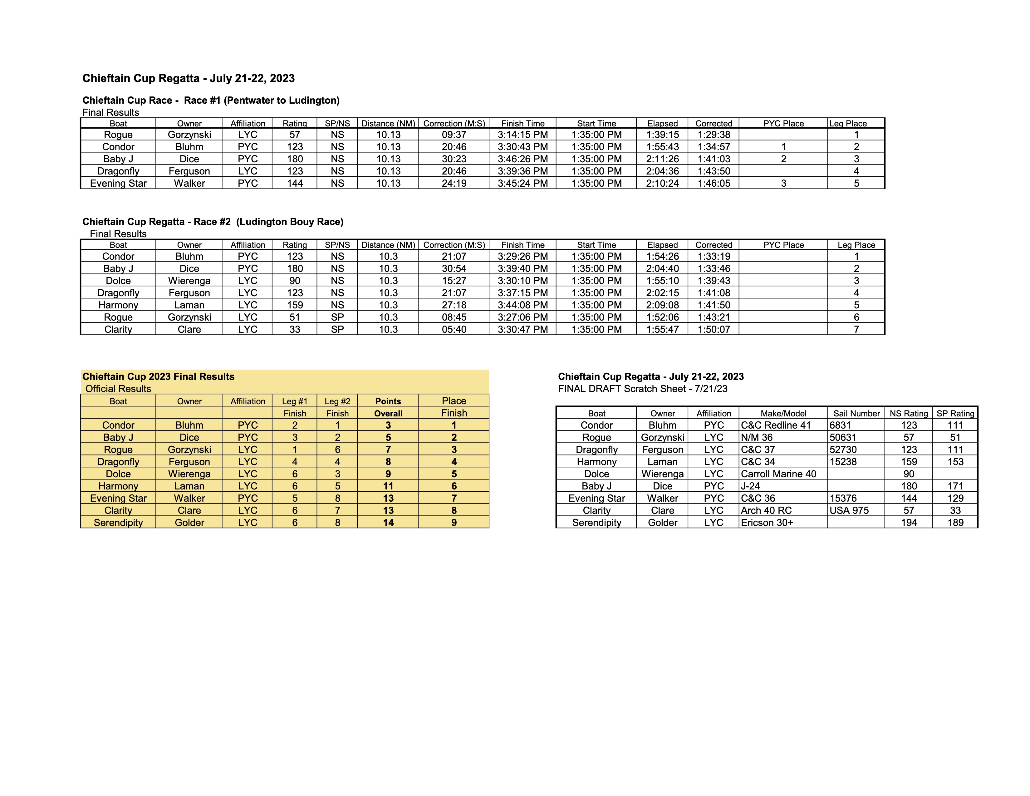 What a great Chieftain Cup weekend it was. Friday saw 5 boats race up from Pentwater and then on Saturday, 2 more boats joined the fleet for a 7 boat buoy race offshore of Ludington. After the race, and allowing ample time for post-race camaraderie, the social committee crew staged a fried chicken dinner for everyone. An awards ceremony followed dinner (results are attached). Thanks to the racing and social committees for organizing this successful event and to Becky who ensured that everyone kept well hydrated!